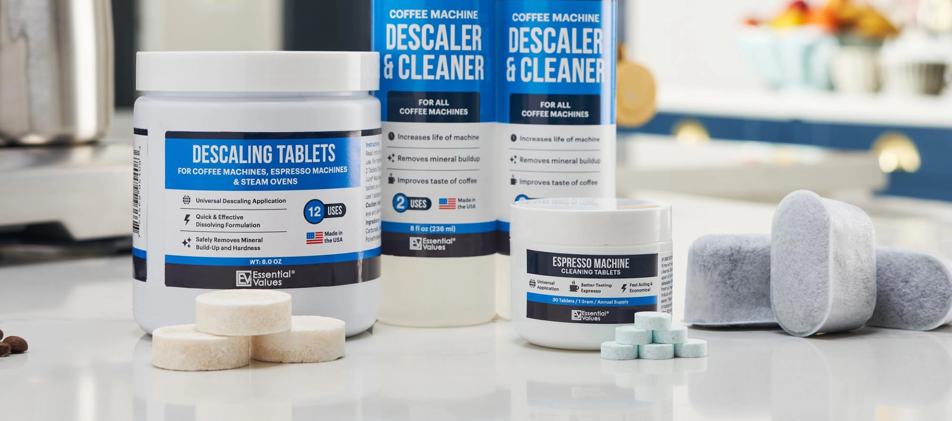 Essential Values Descaling Tablets (12 Count/Up to 12 Uses) for Jura, Miele, Bosch, Tassimo Espresso Machines and Miele Steam Ovens (1 Pack)(12 Count (Pack of 1))