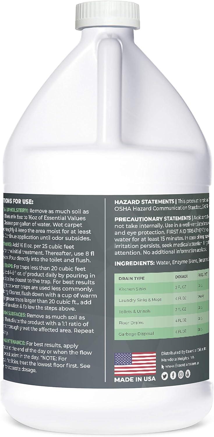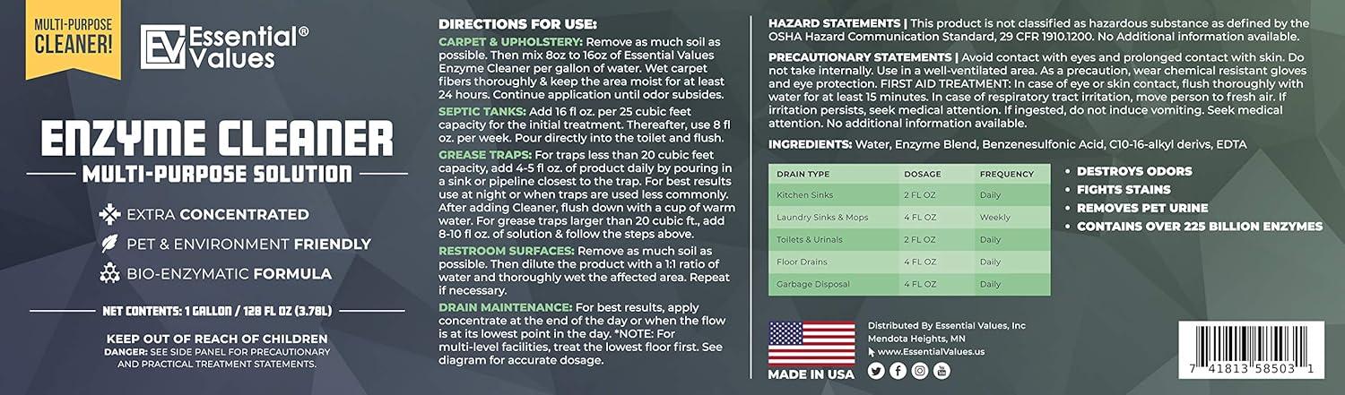 Great Value: The Essential Values Enzyme Cleaner (Gallon/128 FL OZ) is a non-corrosive, non-flammable, non-acid, and cost-effective cleaner for your everyday cleaning needs, eliminating odors at the source.