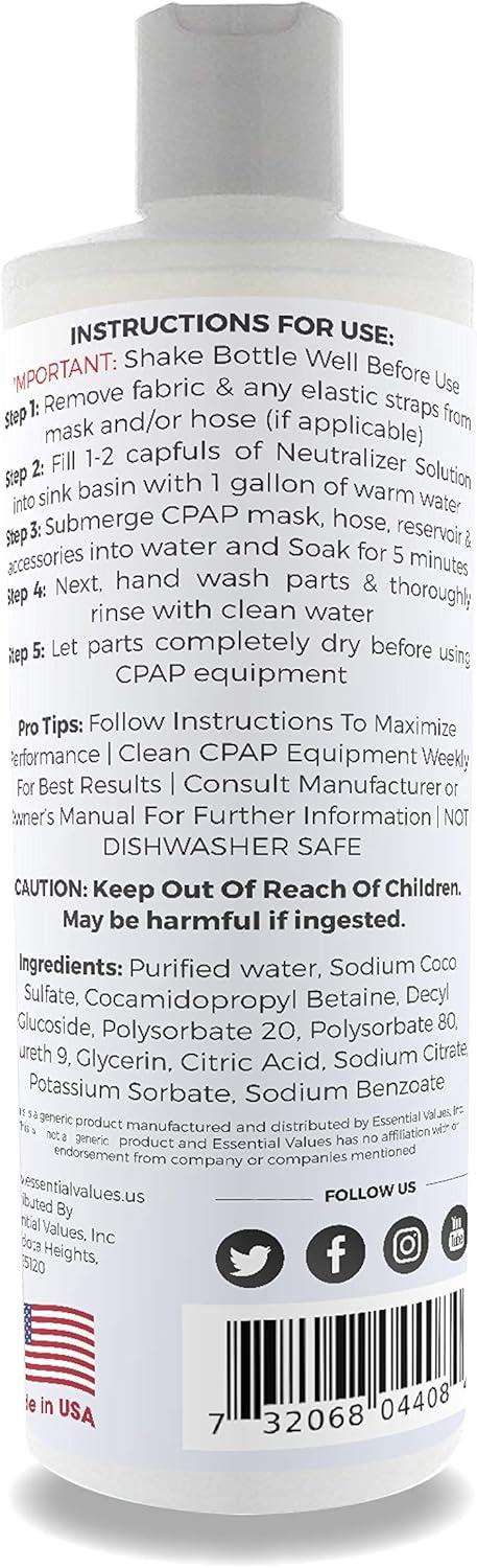 Improves CPAP Performance: Over time, CPAP machines collect debris and odors. Essential Values offers a safe, concentrated formula to extend your machine’s life by neutralizing, cleaning, and removing stains from accessories before sanitizing.