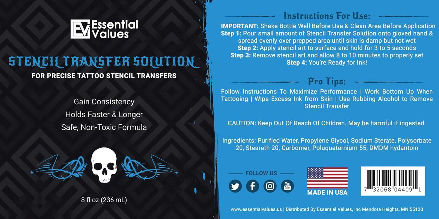 Transfer Gel For Tattoo: Take your tattooing to the next level. Essential Values 8 fl. oz Tattoo Stencil Transfer Solution is safe, effective & long lasting.